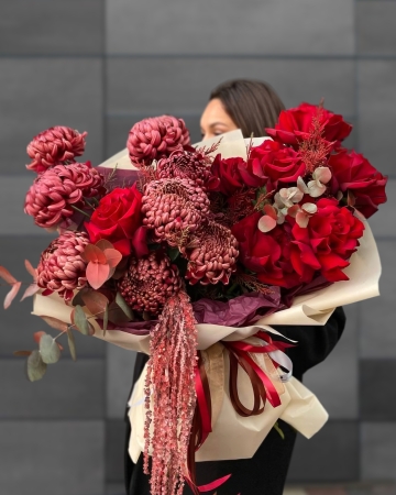 4 Хризантемы Бигуди Рэд, 3 Розы Эксплорер, 2 Анемона Мистраль Плюс Red, 2 Львиных зева