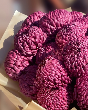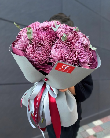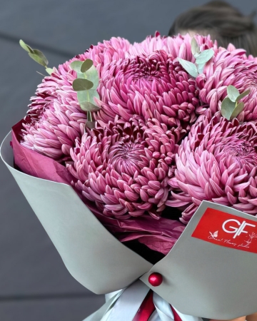 5 Хризантем Бигуди Рэд, 4 Розы Пинк Мондиаль, 3 Розы Мадам Бомбастик
