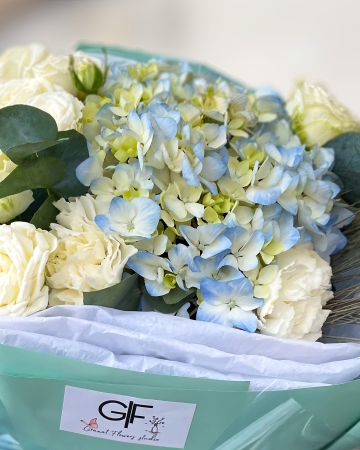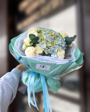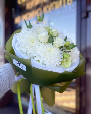 5 Хризантем Фрэд, 2 Розы Мисс Бомбастик, 2 Эустомы Алиса Вайт