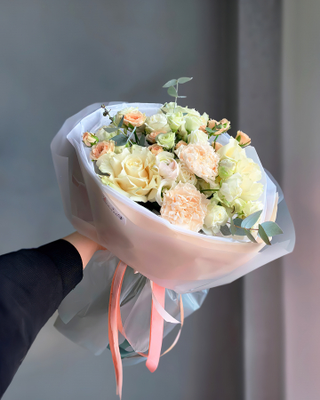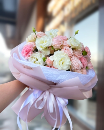 4 Розы Мадам Бомбастик, 4 Эустомы Алиса Вайт, 3 Диантуса Непал