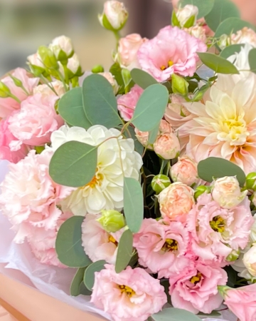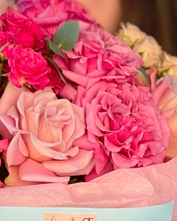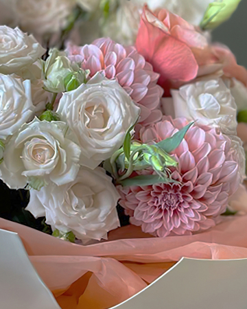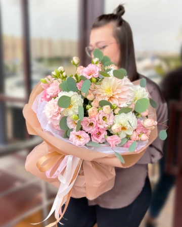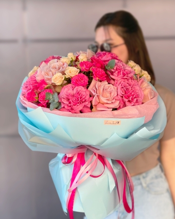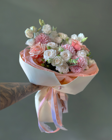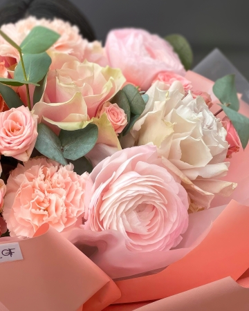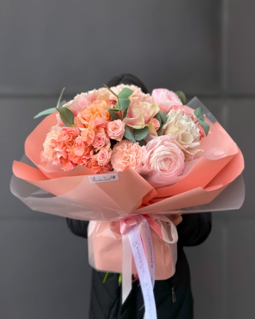 4 Розы Пинк Мондиаль, 4 Диантуса Персик, 2 Ранункулюса Клуни, 1 Гортензия, 3 Розы Лидия
