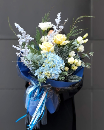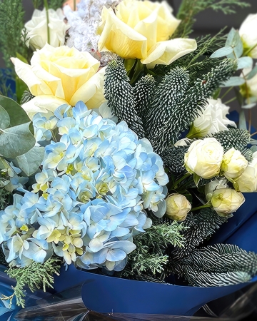 1 Гортензия, 1 Нобилис, 1 Роза Мисс Бомбастик, 2 Розы Шиммер, 2 Эустомы Алиса Вайт