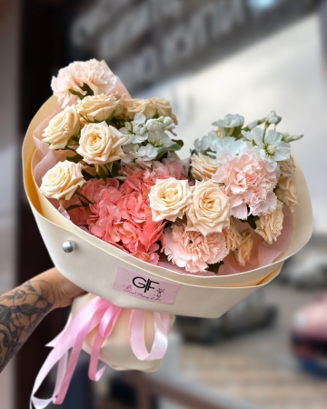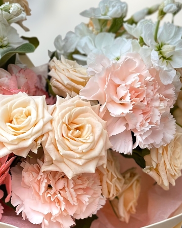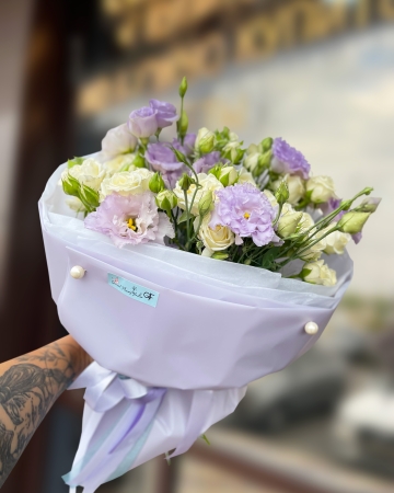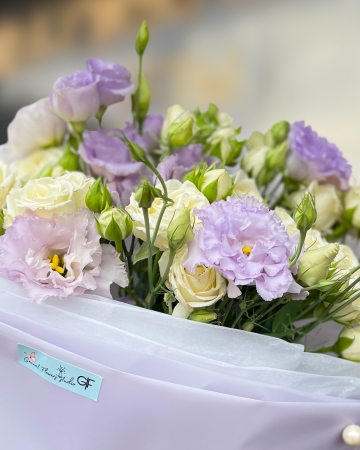 2 Розы Мирабель, 4 Розы Фридом, 1 Дельфиниум Делфис Старлайт, 3 Ириса Блю Мэджик, 2 Анемона Мистраль Плюс Вайт Центро Неро, 2 Диантуса Вертиго