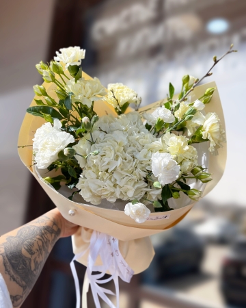 3 Розы Топаз, 1 Гортензия, 4 Диантуса Соломио Фен, 2 Розы Мисти Баблз