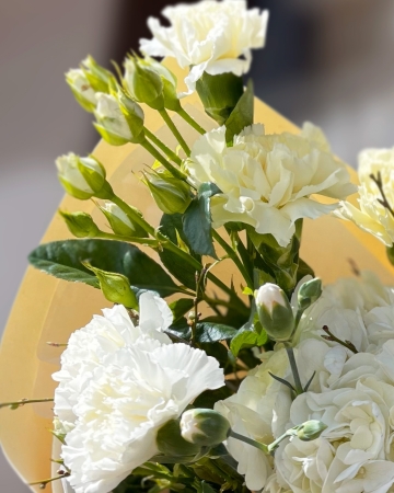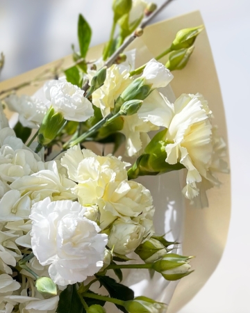 4 Розы Мадам Бомбастик, 4 Эустомы Алиса Вайт, 3 Диантуса Непал