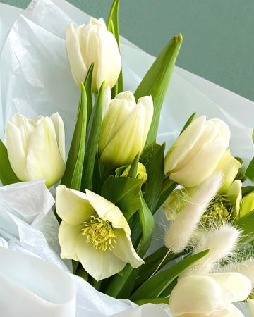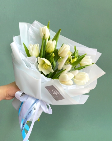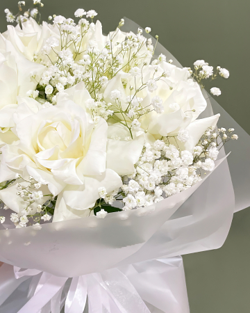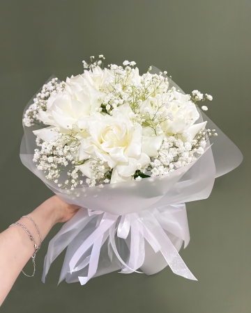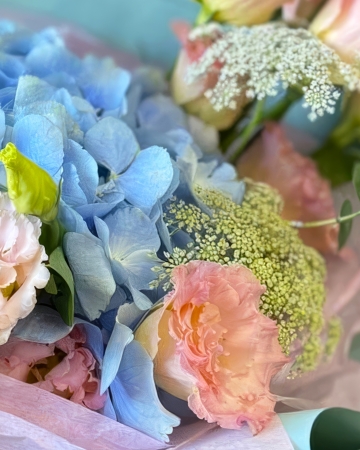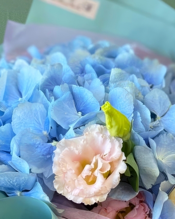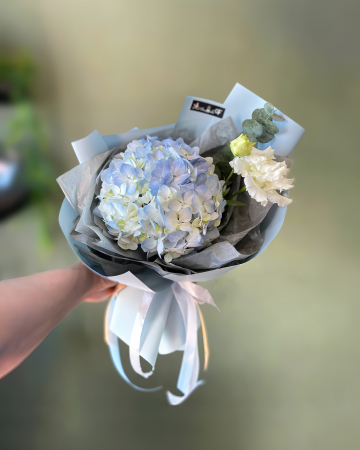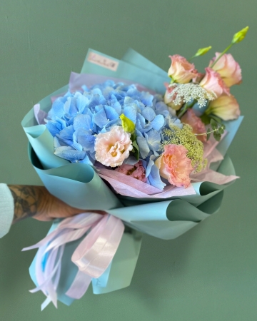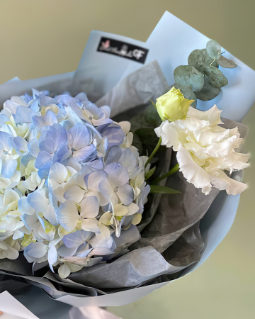 1 Гортензия, 1 Эустома Алиса Вайт, 1 Роза Беларусь
