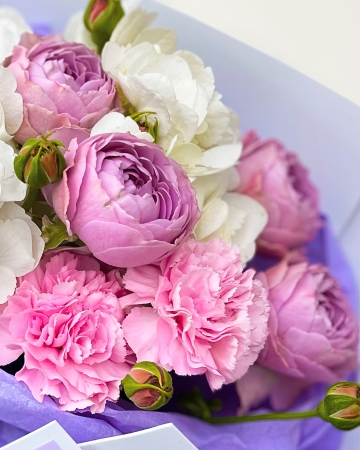 1 Роза Лавандер Лейс, 2 Диантуса, 1 Гортензия